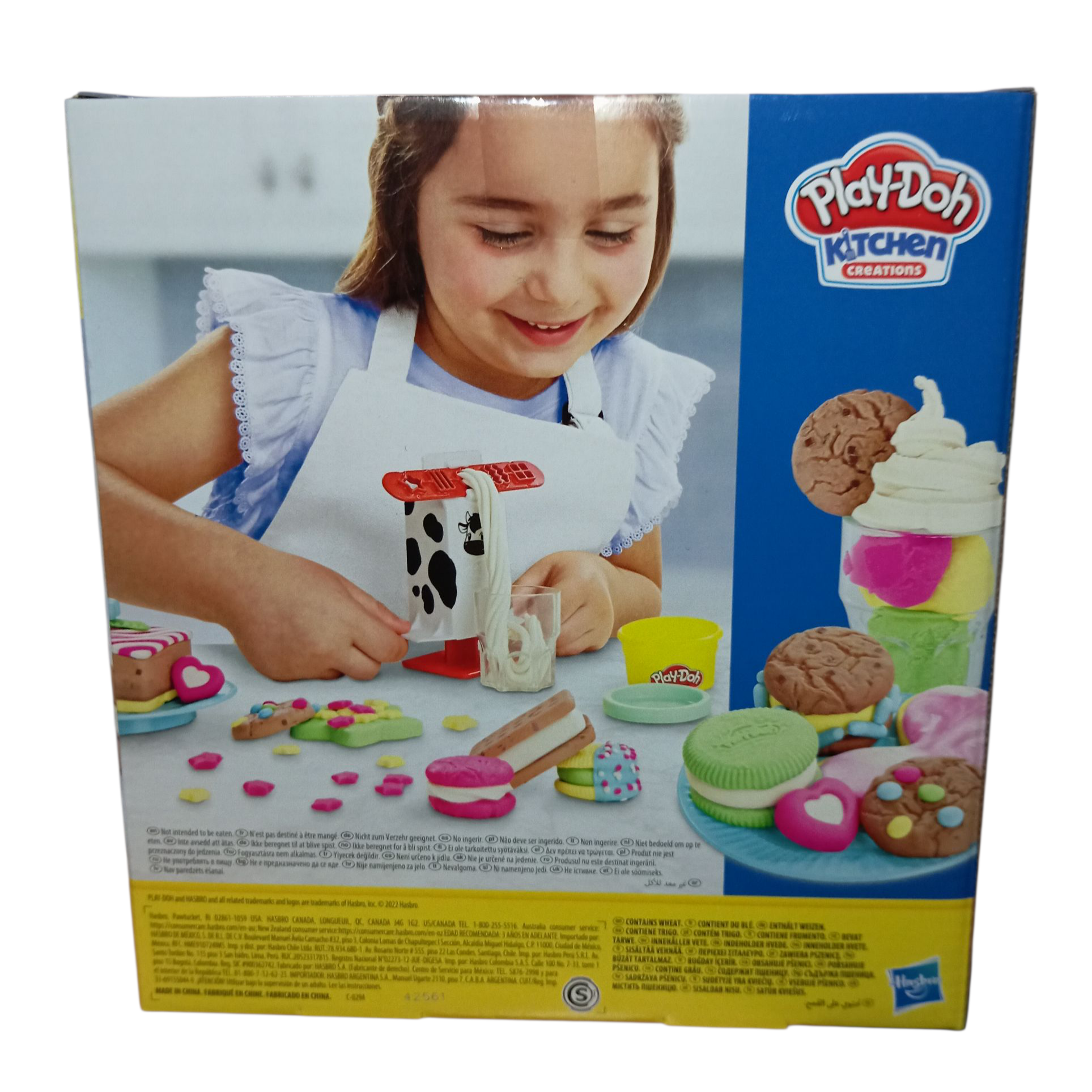 Ce coffret comprend une boîte spéciale qui "verse" du faux lait pour rendre le jeu encore plus réaliste et amusant. Grâce au rail d'extrudeuse Play-Doh, les enfants peuvent créer 5 formes de biscuits différentes en un seul geste. Le kit contient également 6 couleurs Play-Doh , incluant un pot de pâte Play-Doh Confettis idéal pour reproduire des biscuits aux pépites.