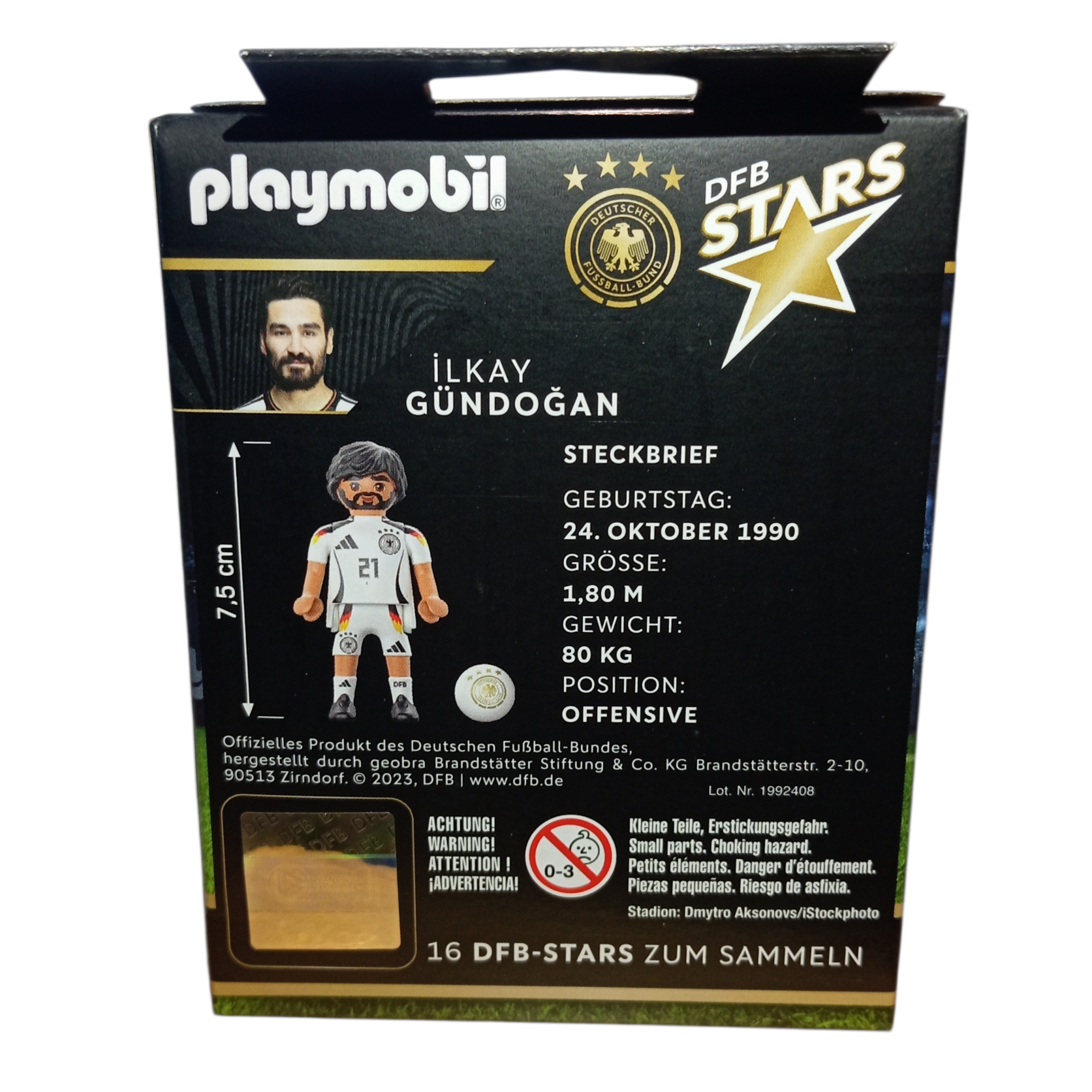 Au dos de la boîte se trouve la pastille officielle DFB, garantissant l’authenticité du produit, ainsi que la fiche du joueur : Ilkay Gündogan, né le 24 octobre 1990, mesurant 1,80 m, pesant 80 kg, et évoluant en position offensive. Une figurine idéale pour revivre les plus belles actions de la Mannschaft ou enrichir une collection Playmobil dédiée au football.