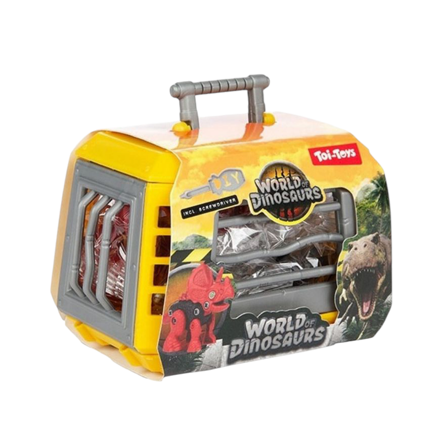 Chaque coffret contient une cage robuste avec poignée de transport et un dinosaure à assembler soi-même à l’aide du tournevis fourni. L’enfant peut visser et dévisser les différentes pièces pour construire son propre dinosaure, stimulant ainsi sa motricité fine, sa concentration et son imagination.